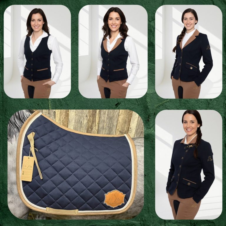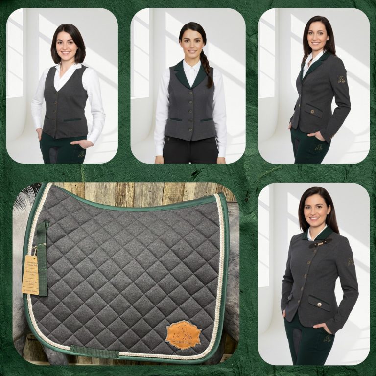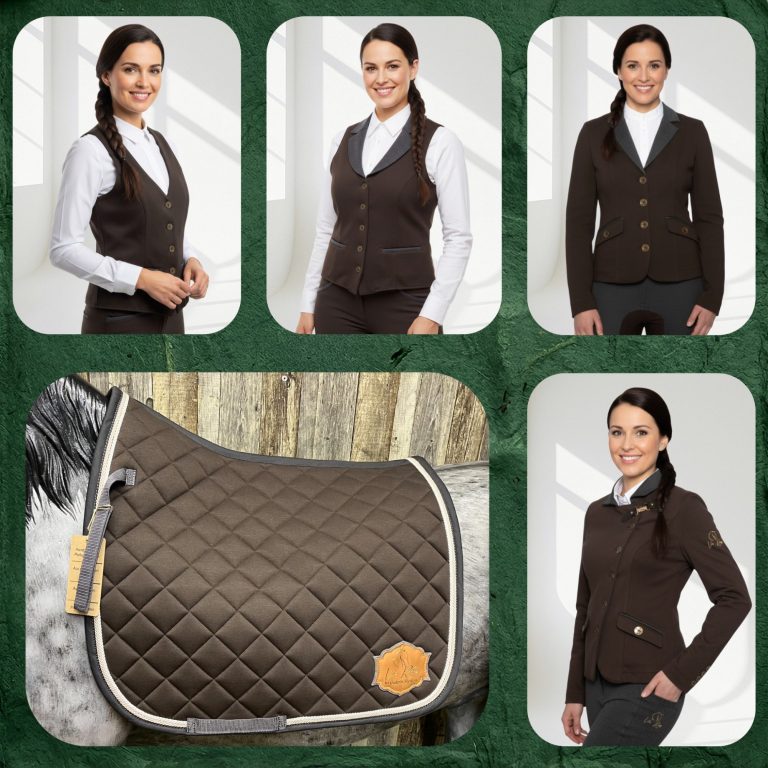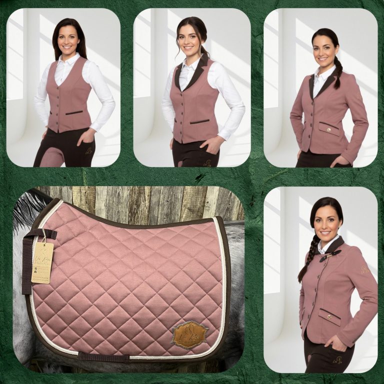 Das Sortiment ist abgestimmt für die Working Equitation und dazu gehören jeweils Reitleggings, Weste, Reitjackett und passende Schabracke in den Farben Blau, Braun, Grau und Rose-Braun.